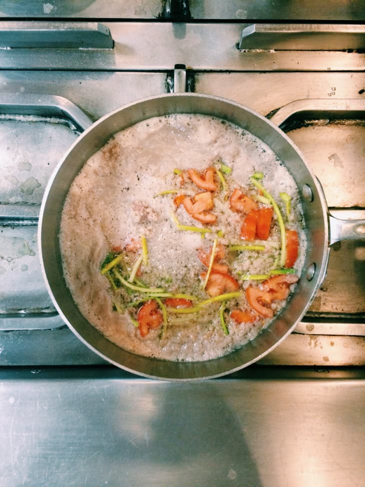 Flip over and cook for another 4 minutes. Carefully slide the spatula under the middle of the fish on the side towards the middle of the wok and in one steady motion lift and flip it towards the outside of the wok.